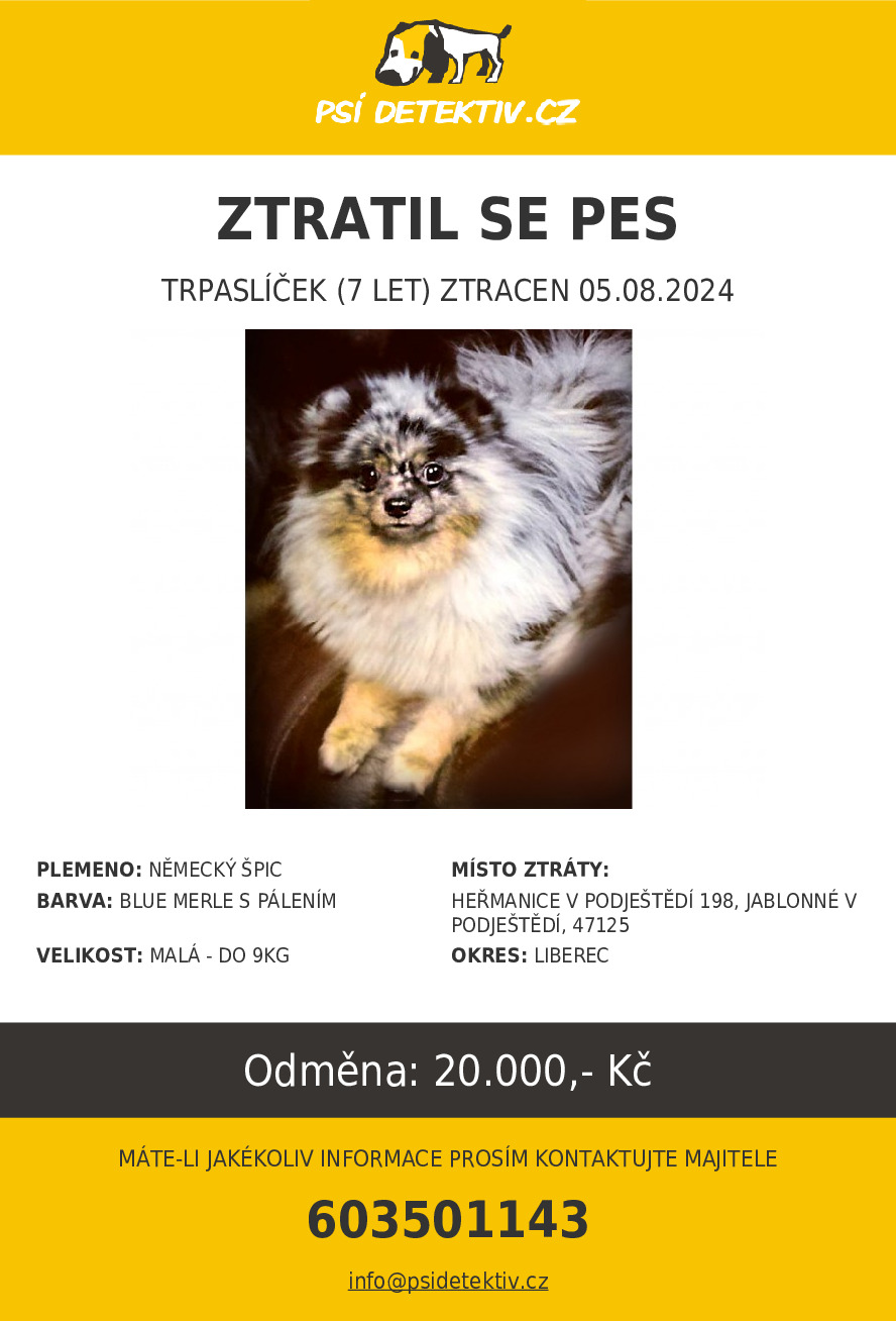 Ztratil se pes Vystaveno: 6.8.2024 Vystavil: Superadmin Superadmin Různé Přílohy trpaslicek-liberec-2024-08-05-74378-psi-detektiv.jpg Obrázek, 187.10 KB Stáhnout Podrobnosti Datum vystavení: 6.8.2024
